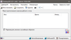 DesktopOK - небольшая бесплатная и портативная (не требующая установки) программа, предназначенная для сохранения и восстановления местоположения иконок на рабочем столе. Утилита запоминает настройки для различных пользователей, позволяет сохранять позицию иконок для разных разрешений экрана, автоматически скрывает и отображает иконки, а также умеет сворачивать все открытые окна. Присутствует функция автосохранения.