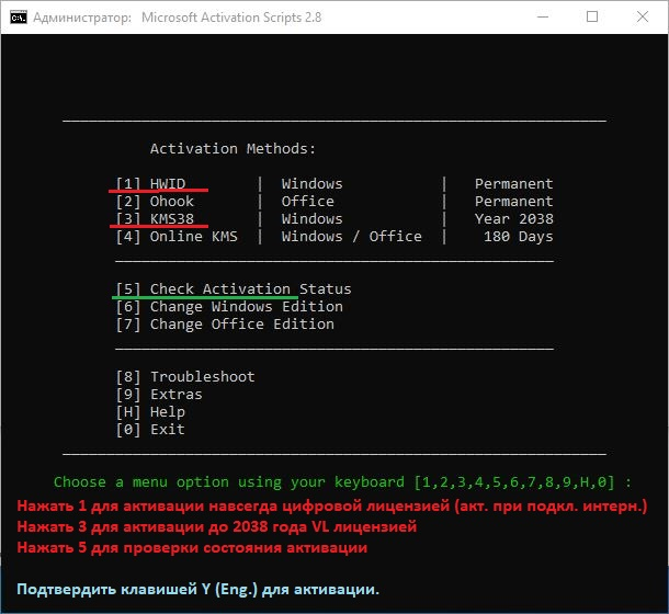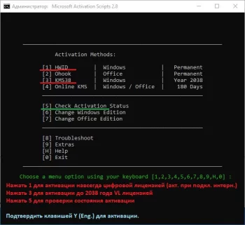 (запускать от Администратора). Рекомендуется Метод HWID (цифровая лицензия) для постоянной активации Windows. Активация происходит после подключения к интернету. Рекомендуется для Домашней и Про. редакций. Метод KMS38 для активации Windows до 2038 года. Активация сразу. Рекомендуется для Про. и Корпоративной редакций.