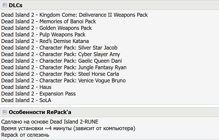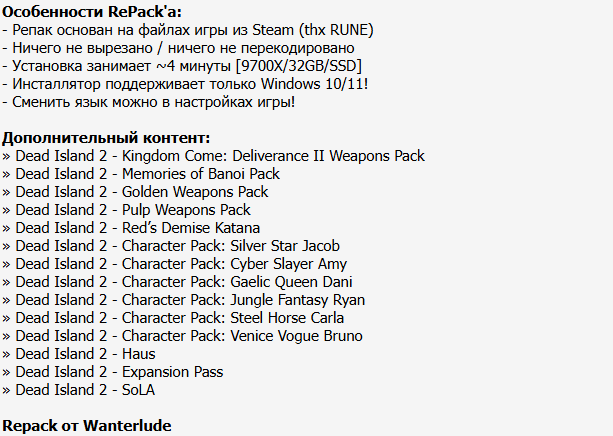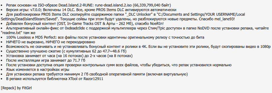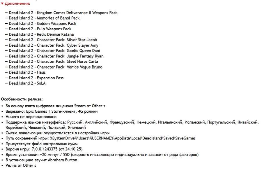 20:52 25.10.2025 — ДОБАВЛЕН РЕПАК ОТ FITGIRL (48.56 GB). Альтернативный онлайн-фикс от 0xdeadc0de с поддержкой мультиплеера через Steam/Epic доступен в папке NoDVD после установки репака, читайте "readme.txt" там же. Для разблокировки PROS Items DLC скопируйте содержимое папки "_DLC Unlocker" в "C:/Dосuments and Settings/YOUR USERNAME/Local Settings/DeadIslandSteam/Saved". Текущие сейвы при этом будут удалены, но разблокируются новые предметы. Спасибо mel_lane93!