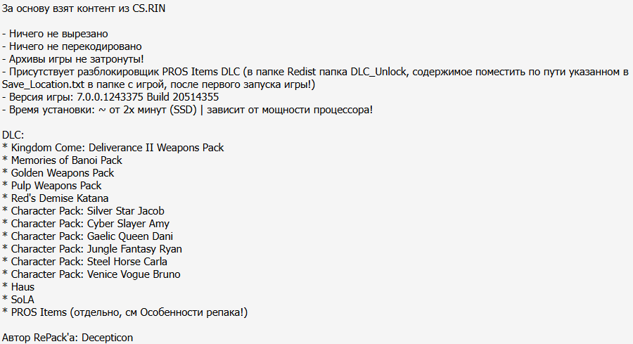 22:20 01.11.2025 — ДОБАВЛЕН РЕПАК ОТ DECEPTICON (60.66 GB). Присутствует разблокировщик PROS Items DLC (в папке Redist папка DLC_Unlock, содержимое поместить по пути указанном в Save_Location.txt в папке с игрой, после первого запуска игры!)