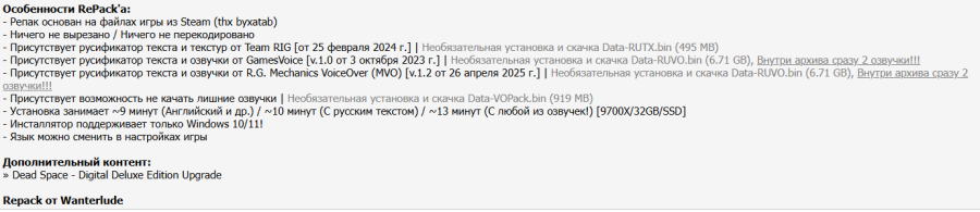 12:30 14.01.2026 — ДОБАВЛЕН РЕПАК ОТ WANTERLUDE (31.66 GB) С РУСИФИКАТОРОМИ ОТ TEAM RIG (ТОЛЬКО ТЕКСТ), RG MVO И GAMESVOICE. Минимальный размер репака (с русским текстом) - 24.0 GB. Русификатор выбирается при установке. Инсталлятор поддерживает только Windows 10/11!