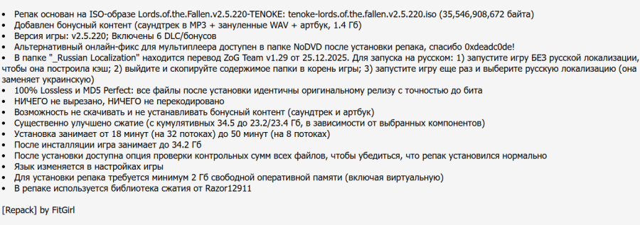 + репак от FitGirl обновлен до аналогичной версии. В папке "_Russian Localization" находится перевод ZoG Team v1.29 от 25.12.2025. Для запуска на русском: 1) запустите игру БЕЗ русской локализации, чтобы она построила кэш; 2) выйдите и скопируйте содержимое папки в корень игры; 3) запустите игру еще раз и выберите русскую локализацию (она заменяет украинскую) Альтернативный онлайн-фикс для мультиплеера доступен в папке NoDVD после установки репака, спасибо 0xdeadc0de!