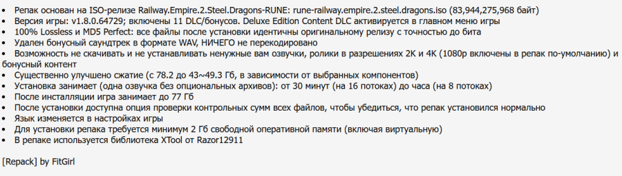 18:50 31.10.2025 — РЕПАК ОТ FITGIRL (49.33 GB) ОБНОВЛЕН ДО ВЕРСИИ v 1.8.0.64729 (Build 20284616) + 11 DLC/бонусов. ВНИМАНИЕ! Минимальный размер репака - 43 GB, можно не скачивать и не устанавливать ненужные вам озвучки, ролики в разрешениях 2K и 4K (1080p включены в репак по-умолчанию) и бонусный контент