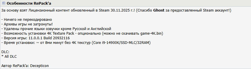 20:46 01.12.2025 — РЕПАК ОТ DECEPTICON (124.78 GB) ОБНОВЛЁН ДО ВЕРСИИ 11.0.0.1 (build 20932116) + ВСЕ DLC. В названии самого репака ошибка, случайно прописан номер прошлой версии. ВНИМАНИЕ: Если вам не нужны 4K текстуры, то не можно не скачивать архив game-4K.bin, тогда репак будет весить 54.25 GB