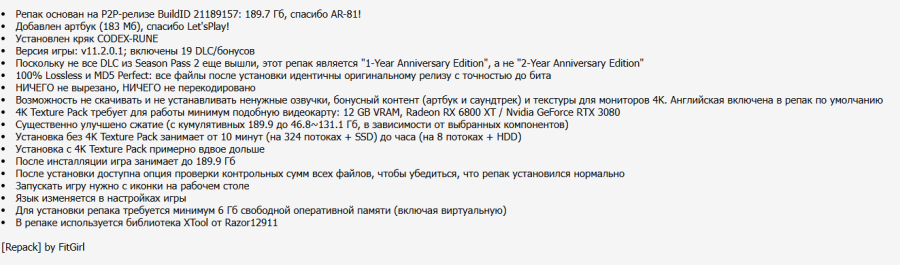 17:56 09.01.2026 — РЕПАК ОТ FITGIRL (131.06 GB) ОБНОВЛЁН ДО ВЕРСИИ 11.2.0.1 (в свойствах exe) / build 21189157 (SteamDB). ВНИМАНИЕ: Минимальный размер репака 46.8 GB, можно не скачивать и не устанавливать ненужные озвучки, бонусный контент (артбук и саундтрек) и текстуры для мониторов 4K. Английская включена в репак по умолчанию 4K Texture Pack требует для работы минимум подобную видеокарту: 12 GB VRAM, Radeon RX 6800 XT / Nvidia GeForce RTX 3080