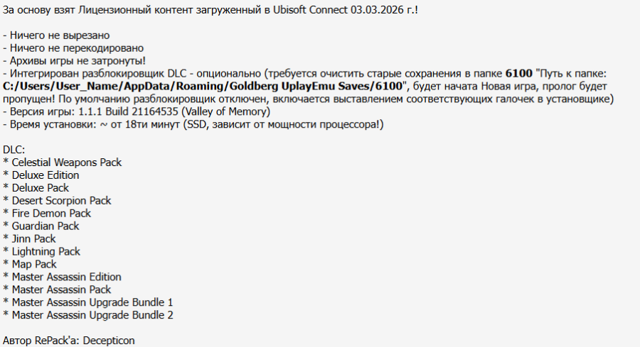 21:26 15.03.2026 — РЕПАК ОТ DECEPTICON (23.99 GB) ОБНОВЛЕН: v 1.1.1 + ВСЕ DLC, ВКЛЮЧАЯ СЮЖЕТНОЕ + ИНТЕГРИРОВАН РАЗБЛОКИРОВЩИК DLC (опционально - требуется очистить старые сохранения в папке 6100 "Путь к папке: C:/Users/User_Name/AppData/Roaming/Goldberg UplayEmu Saves/6100", будет начата Новая игра, пролог будет пропущен! По умолчанию разблокировщик отключен, включается выставлением соответствующих галочек в установщике) + ИСПРАВЛЕННАЯ ТАБЛЕТКА VOICES38