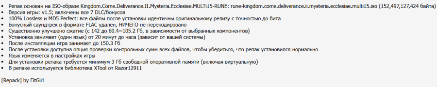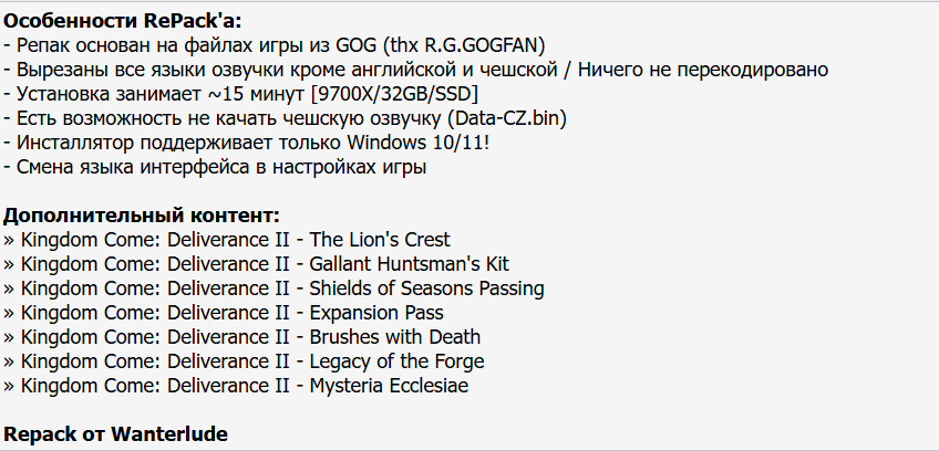 20:52 12.11.2025 — РЕПАК ОТ WANTERLUDE (67.69 GB) ОБНОВЛЕН ДО ВЕРСИИ 1.5 (Build 20641503) + ДОБАВЛЕНО ФИНАЛЬНОЕ DLC Mysteria Ecclesiae. Минимальный размер репака 66.2 ГБ, можно не качать чешскую озвучку - Data-CZ.bin (12.9 ГБ). Инсталлятор поддерживает только Windows 10/11!