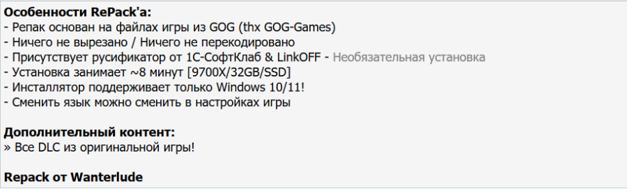 19:38 24.09.2025 — ДОБАВЛЕН РЕПАК ОТ WANTERLUDE С РУСИФИКАТОРОМ (7.46 GB), ВЕРСИЯ ИГРЫ 1.0.1041.4326 (меню) / Partch 5 / build 19470112 (SteamDB). Инсталлятор поддерживает только Windows 10/11!