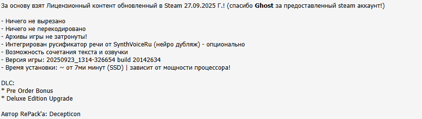 13:53 09.10.2025 — РЕПАК ОТ DECEPTICON ОБНОВЛЕН: Добавлен русификатор речи от SynthVoiceRu (нейродубляж). Ранее скачавшие могут перехешировать и докачать измененные файлы (656 мб)