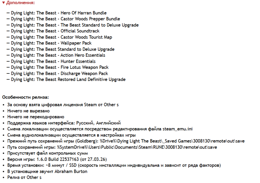 20:30 18.01.2026 — РЕПАК ОТ WANTERLUDE СО ВСЕМИ ТЕКСТОВЫМИ ЛОКАЛИЗАЦИЯМИ, ОЗВУЧКА РУС И АНГ (38.23 GB) ОБНОВЛЕН ДО ВЕРСИИ 1.5.1 (Build 21506105). Язык меняется через Language Changer или steam_emu.ini. Инсталлятор поддерживает только Windows 10/11!