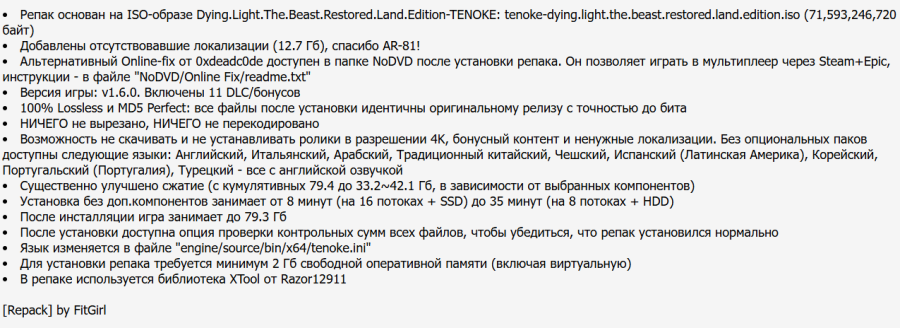 15:38 30.03.202 — РЕПАКИ ОТ FITGIRL СО ВСЕМИ ЛОКАЛИЗАЦИЯМИ (42.07 GB) ОБНОВЛЁН ДО ВЕРСИИ 1.6.0 (Build 22510629) RESTORED LAND EDITION. ВНИМАНИЕ! Минимальный размер репака - 33.2 GB, можно не скачивать и не устанавливать ролики в разрешении 4K, бонусный контент и ненужные локализации. Без опциональных паков доступны следующие языки: Английский, Итальянский, Арабский, Традиционный китайский, Чешский, Испанский (Латинская Америка), Корейский, Португальский (Португалия), Турецкий - все с английской озвучкой. Язык изменяется в файле "engine/source/bin/x64/tenoke.ini"  Альтернативный Online-fix от 0xdeadc0de доступен в папке NoDVD после установки репака. Он позволяет играть в мультиплеер через Steam+Epic, инструкции - в файле "NoDVD/Online Fix/readme.txt".