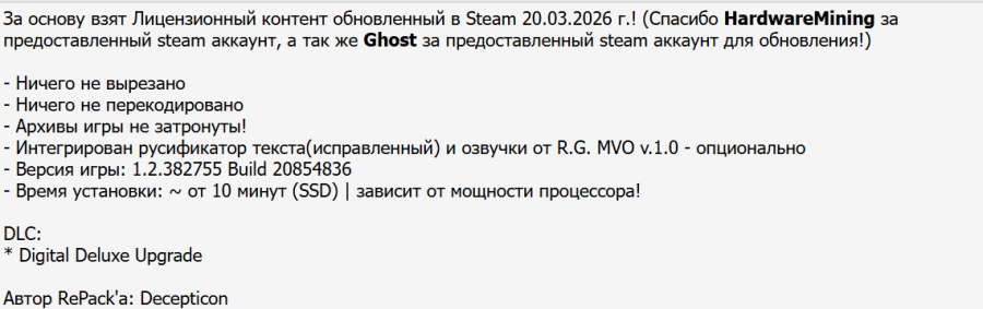 17:46 21.03.2026 — РЕПАК ОТ DECEPTICON (32.03 GB) ОБНОВЛЕН ДО ВЕРСИИ 1.2.382755.0 + ДОБАВЛЕНА РУССКАЯ ОЗВУЧКА ОТ R.G. MVO