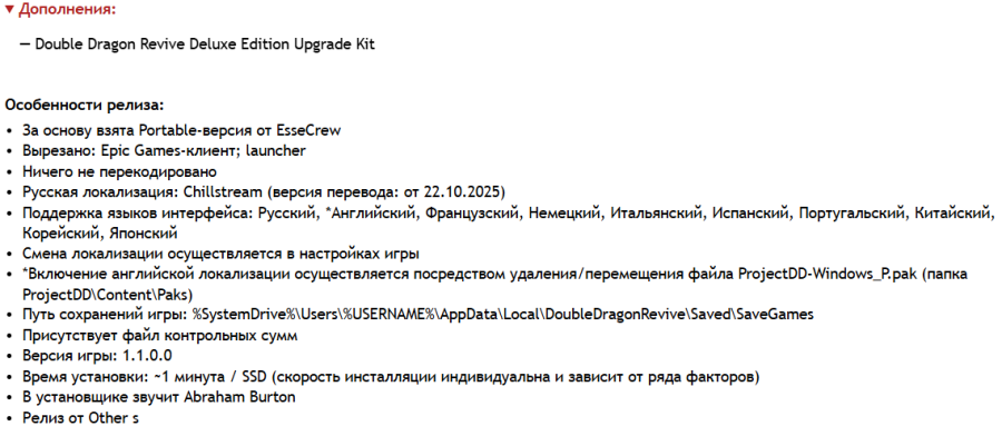 06:10 14.12.2025 — ДОБАВЛЕН РЕПАК ОТ OTHER S С РУСИФИКАТОРОМ (9.70 GB). Включение английской локализации осуществляется посредством удаления/перемещения файла ProjectDD-Windows_P.pak (папка ProjectDD\Content\Paks)