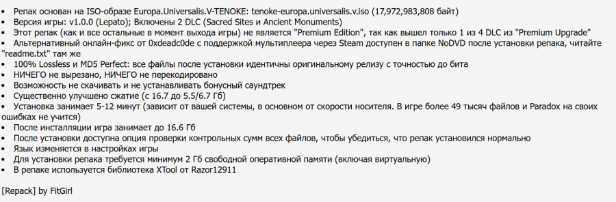 15:02 05.11.2025 — ДОБАВЛЕН РЕПАК ОТ FITGIRL (6.73 GB). ВНИМАНИЕ! Минимальный размер репака - 5.5 GB, можно не скачивать и не устанавливать бонусный саундтрек. Альтернативный онлайн-фикс от 0xdeadc0de с поддержкой мультиплеера через Steam доступен в папке NoDVD после установки репака, читайте "readme.txt" там же