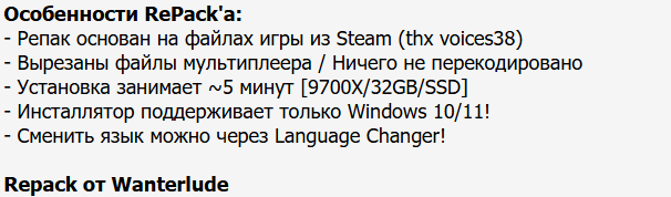 17:38 15.11.2025 — ДОБАВЛЕН РЕПАК ОТ WANTERLUDE (20.35 GB). Вырезаны файлы мультиплеера. Сменить язык можно через Language Changer! Инсталлятор поддерживает только Windows 10/11!