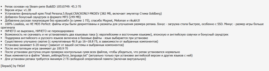 06:02 20.12.2025 — ДОБАВЛЕН РЕПАК ОТ FITGIRL С ФИНАЛЬНОЙ ВЕРСИЕЙ КРЯКА ДЛЯ 1.03B (18.78 GB). Минимальный размер репака - 16 GB. можно не скачивать и не устанавливать два языковых пака (с европейскими и восточными языками), японскую и английскую озвучки и бонусный саундтрек