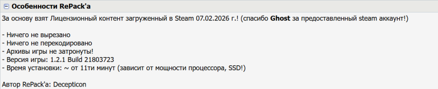 13:34 08.02.2026 — ДОБАВЛЕНЫ РЕПАКИ ОТ DECEPTICON (23.29 GB) И FITGIRL (22.75 GB)