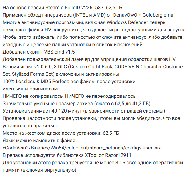 Чтобы включить русский язык, по пути CodeVein2\Binaries\Win64\coldclient\steam_settings в файле configs.user.ini измени language=english на language=russian