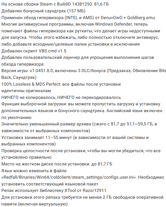 Чтобы включить русский, по пути ..Redfall\Binaries\Win64\coldclient\steam_settings в файле configs.user.ini изменить строку language=english на language=russian (не забудьте сохранить файл после изменения)
