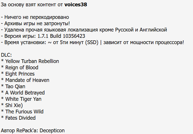19:45 15.10.2025 — ЗАМЕНА ОСНОВНОЙ РАЗДАЧИ НА РЕПАК ОТ WANTERLUDE, НОВЫЙ ВЗЛОМ (таблетка voices38 v2) + ПОСЛЕДНЯЯ ВЕРСИЯ ИГРЫ 1.7.1 Build 17847.0 (в меню) / build 10356423 (SteamDB) от 19 января 2023. Язык меняется в настройках игры (звук) или в файле language.txt. Инсталлятор поддерживает только Windows 10/11!