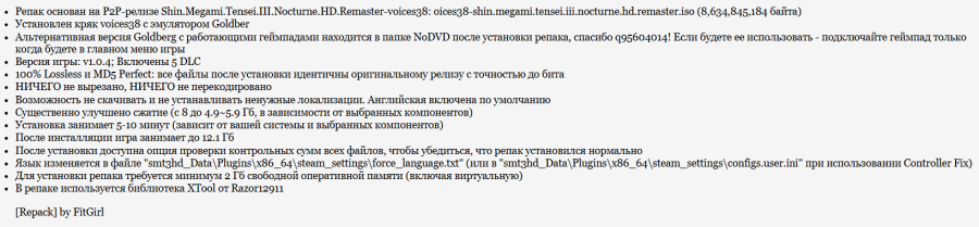 17:10 25.11.2025 — ДОБАВЛЕН РЕПАК ОТ FITGIRL (5.91 GB). ВНИМАНИЕ! Минимальный размер репака - 4.9 GB, можно не скачивать и не устанавливать ненужные локализации. Английская включена по умолчанию. Альтернативная версия Goldberg с работающими геймпадами находится в папке NoDVD после установки репака, спасибо q95604014! Если будете ее использовать - подключайте геймпад только когда будете в главном меню игры. Язык изменяется в файле "smt3hd_Data\Plugins\x86_64\steam_settings\force_language.txt" (или в "smt3hd_Data\Plugins\x86_64\steam_settings\configs.user.ini" при использовании Controller Fix)